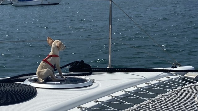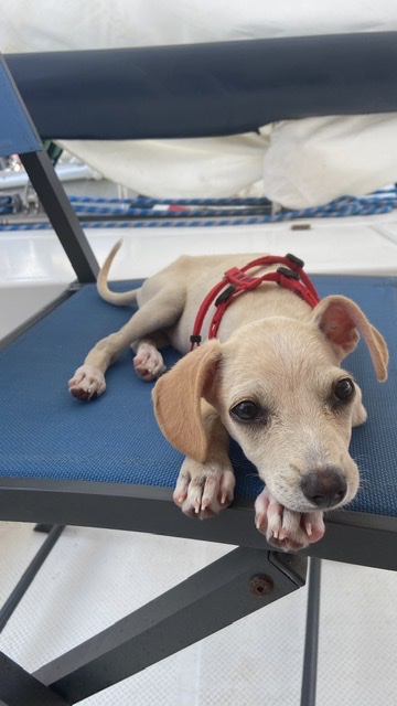 Voilà 15 jours maintenant que nous apprenons à nous connaître. J’ai beaucoup de chance, elle n’a aucun souci avec le bateau, ses bruits et ses mouvements, et ne semble pas sujette au mal de mer. Elle fait déjà 99% de ses besoins dehors, ma seule contrainte étant qu’elle n’a pas d’endroit prédéfini, c’est un peu la course à la crotte chaque jour.