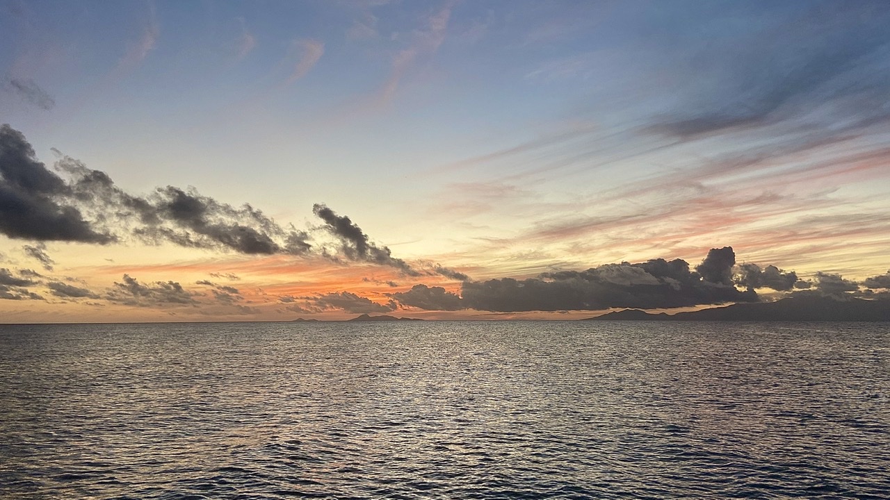 Voilà trois jours que je suis mouillé à Marie Galante, et c’ est le premier soir sans averse. La première journée sans pluie, en fait.