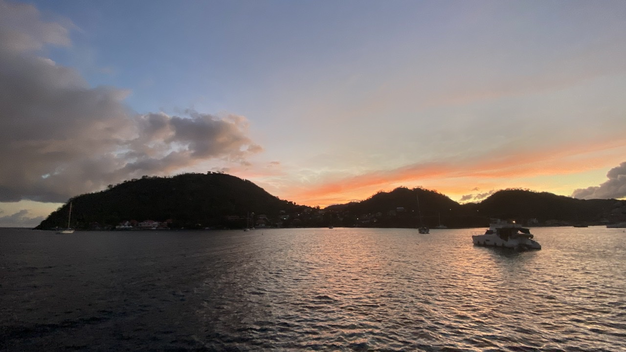 Voilà trois jours que je suis mouillé à Marie Galante, et c’ est le premier soir sans averse. La première journée sans pluie, en fait.